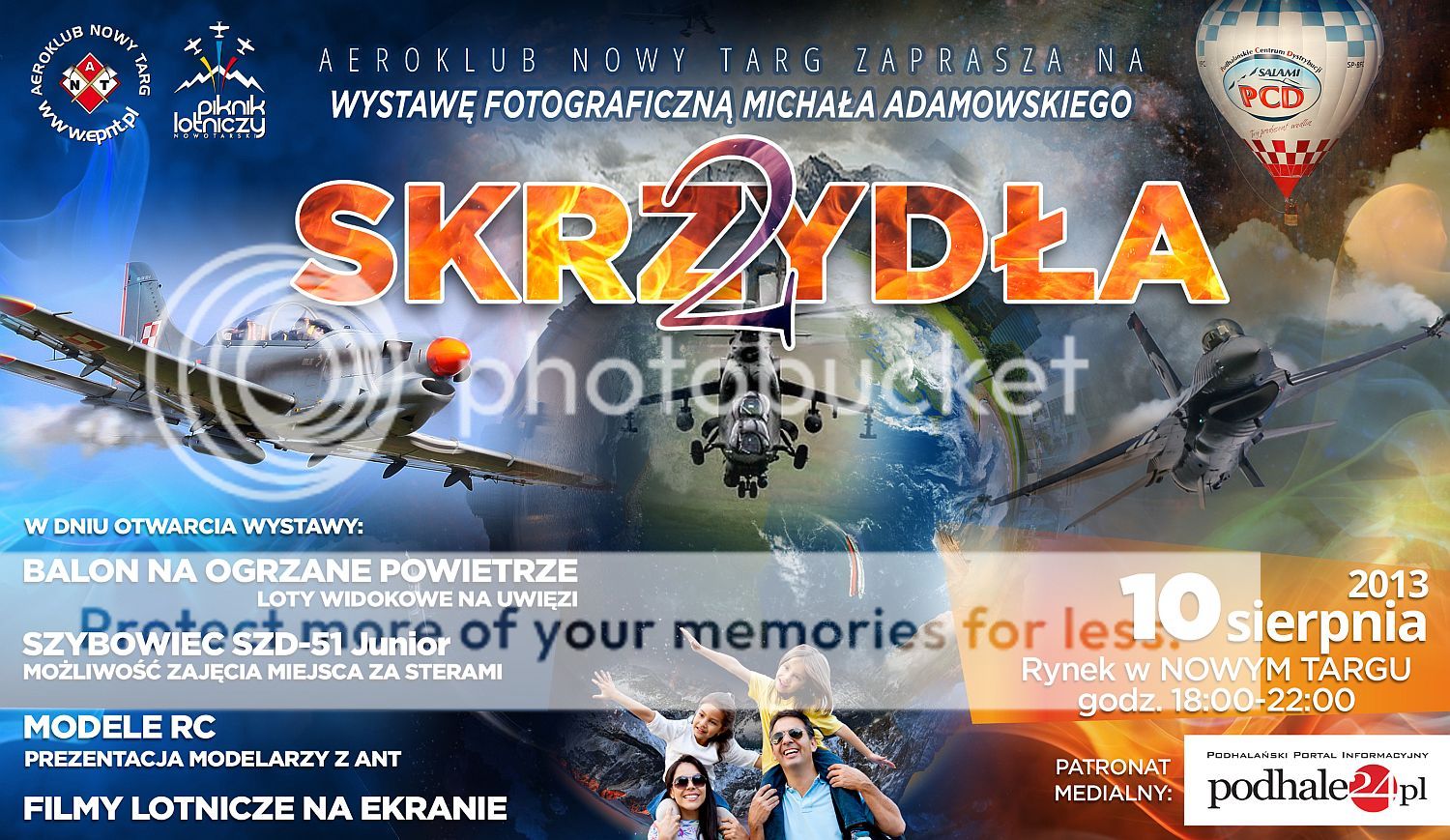Prezes Aeroklubu Nowy targ serdecznie zaprasza na otwarcie wystawy fotograficznej autorstwa Michała Adamowskiego pt. „Skrzydła 2”, które odbędzie się w sobotę 10 sierpnia 2013r. o godz. 18.00 na Rynku w Nowym Targu. Będzie to kontynuacja zainteresowań lotniczych Michała (pierwsza część odbyła się w zeszłym roku na tydzień przed Nowotarskim Piknikiem Lotniczym), ale zdjęcia pokazane na Rynku, będą tym razem z przedziału czasowego od zeszłorocznego Pikniku w Nowym Targu do dzisiaj.